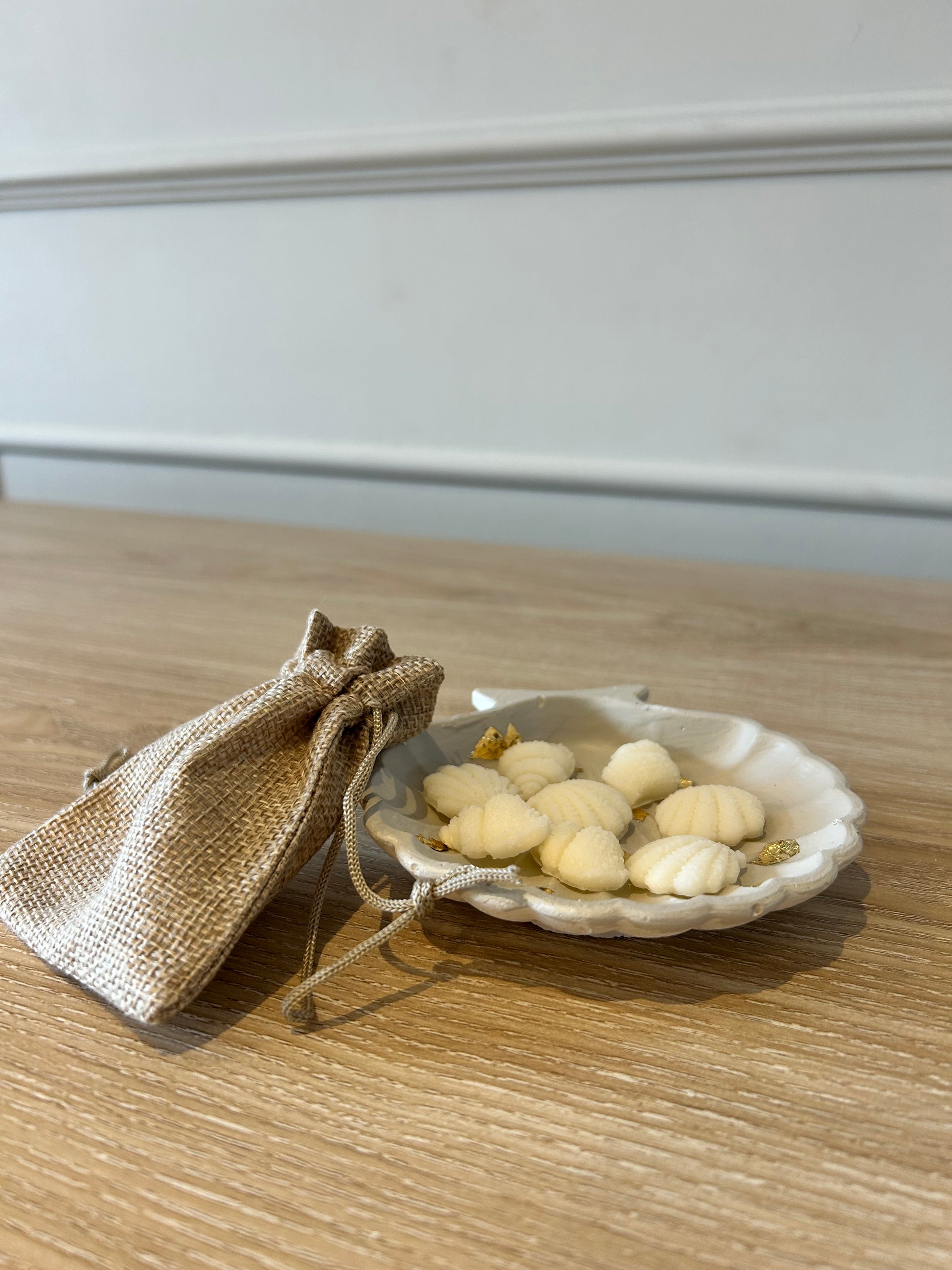 Also comes with a selection of shell wax melts in a small hessian bag