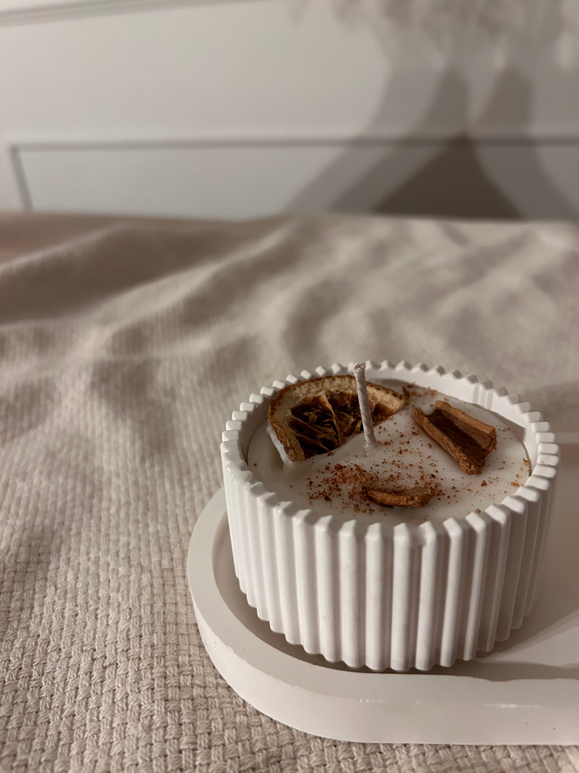 Winter candle in pot topped with cinnamon and dried orange. Lovingly handmade using 100% vegan friendly soy wax and made with a sweet vanilla scent.